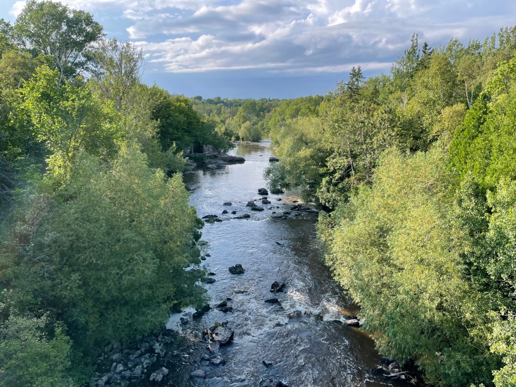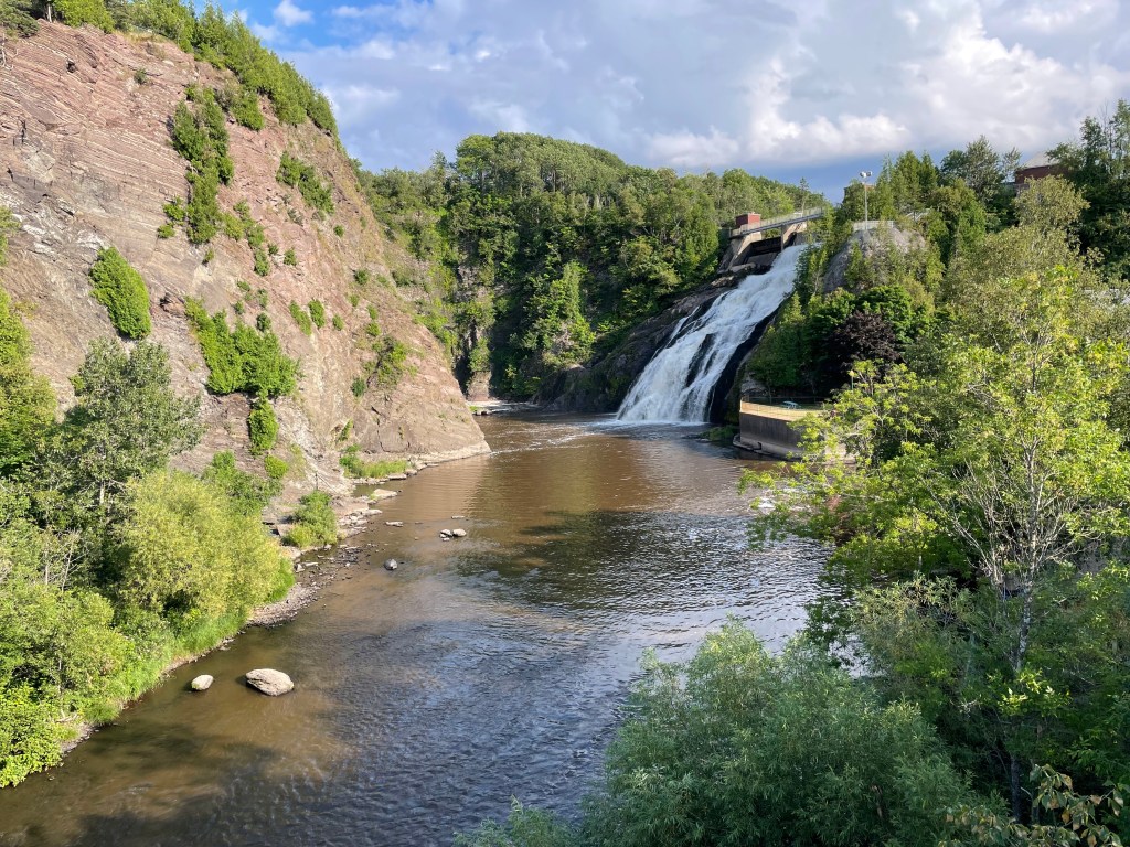 The first surprise of our two-night stay was the Airbnb. It used to be a restaurant and was newly renovated into an inn (2023), so with respect to the theme, it was called Auberge du Pub (the Pub’s Inn). The room was big, modern, clean, and it had a mini fridge. It was very well located between downtown and a large, lovely park: Waterfall Park. I took a small hike in that park the afternoon we arrived while my mom took a nap. It was beautiful, peaceful, and at the perfect time: about an hour before sunset, when the light dims down to a beautiful golden hue. I wish I could have hiked longer, because the little bit I did walk was enough to reach and admire beautiful rapids.